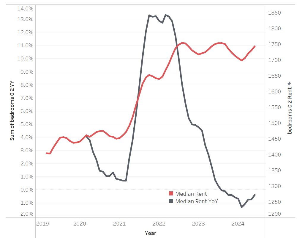 Median rent declines year over year, hovering just below 2022 peak